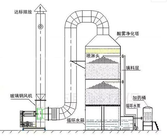 废气喷淋塔是酸雾废气由风管引入净化塔,经过填料层,废气与氢氧化钠吸收液进行气液两相充分接触吸收中和反应,酸雾废气经过净化后,再经除雾板脱水除雾后由风机排入大气,达到净化结果。废气处理净化效果图如下: